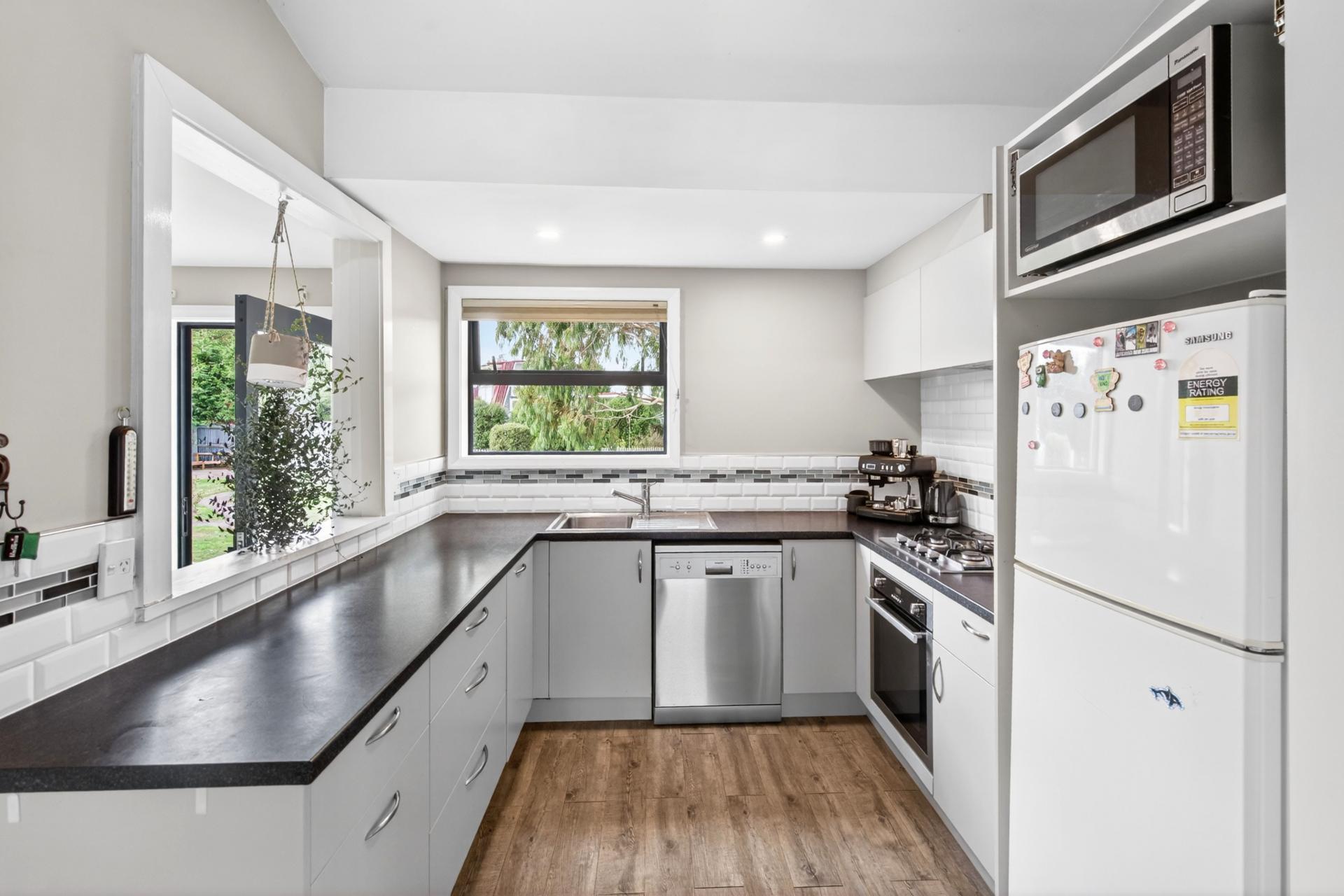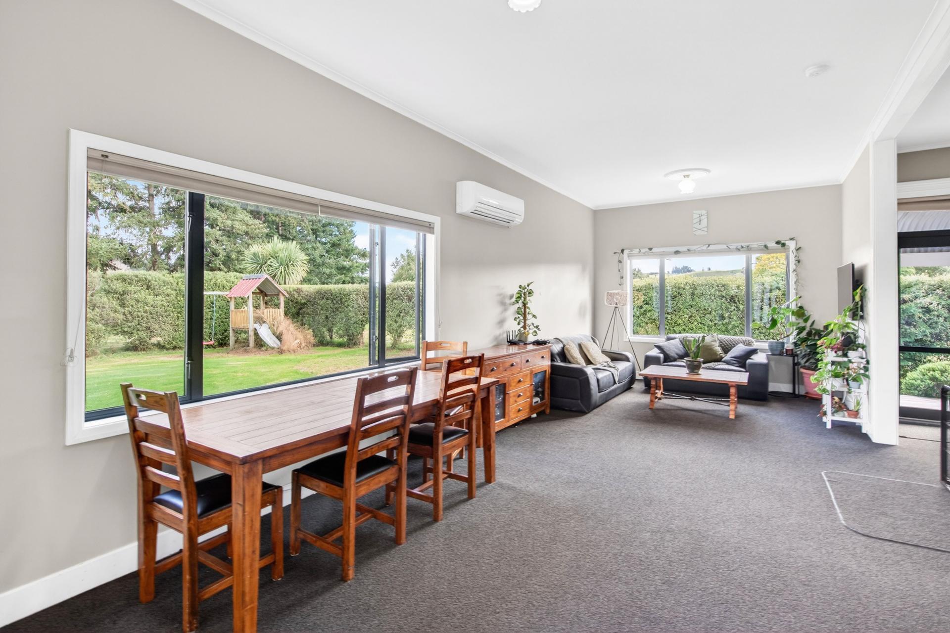 The home is a cosy and well maintained three bedroom residence, featuring a modern kitchen, updated bathroom, and light filled open plan living. All bedrooms are generously sized, creating a comfortable and practical layout for everyday living. Year round comfort is ensured with a heat pump, log burner, partial underfloor heating, double glazing, and insulation.