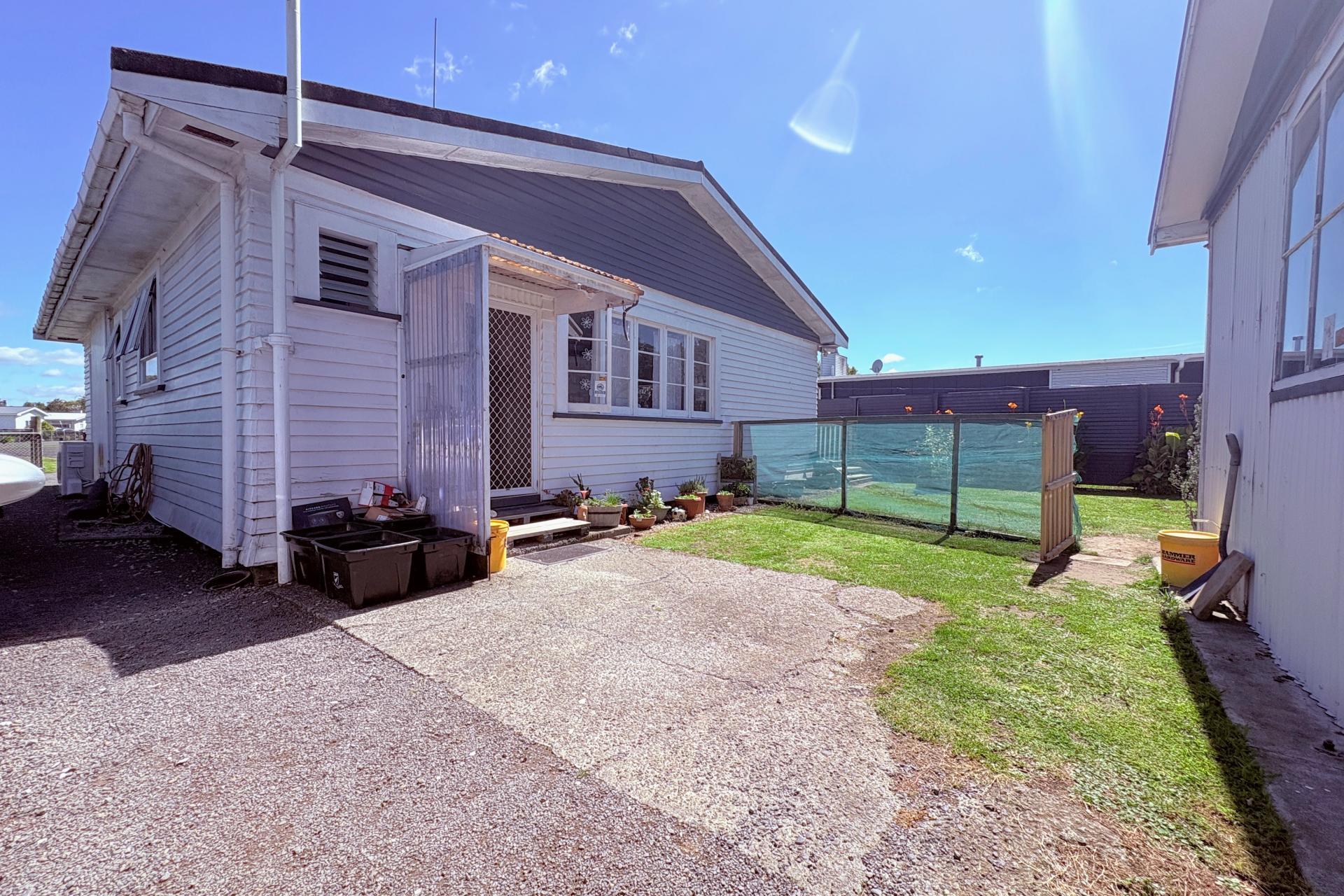 There is a functional bathroom (separate toilet) and kitchen that you may improve over time. The smaller section is well fenced, and less time mowing means more time in the shed. The laundry is tucked to the side of the garage, a few meters from the back door.