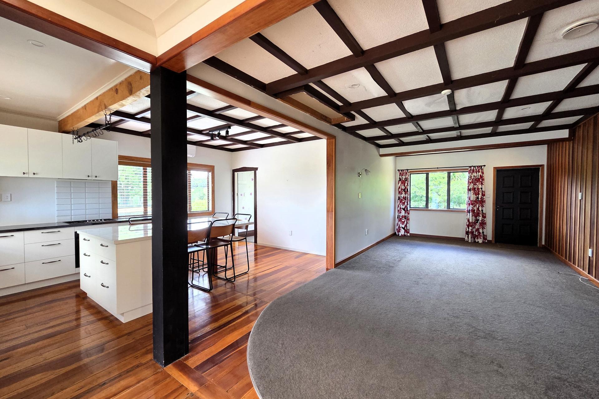 Polished timber floors and stunning kauri and macrocarpa accents create a warm, inviting atmosphere, while the contemporary kitchen with its generous island, gas oven and hob, and ample storage makes entertaining a delight. Enjoy year round comfort with a wood burner, heat pump, HRV system, and insulation underfloor and in the ceiling. The bathroom features a shower over bath and vanity, complemented by a separate toilet. Some finishing touches remain, offering an opportunity to add your personal style.