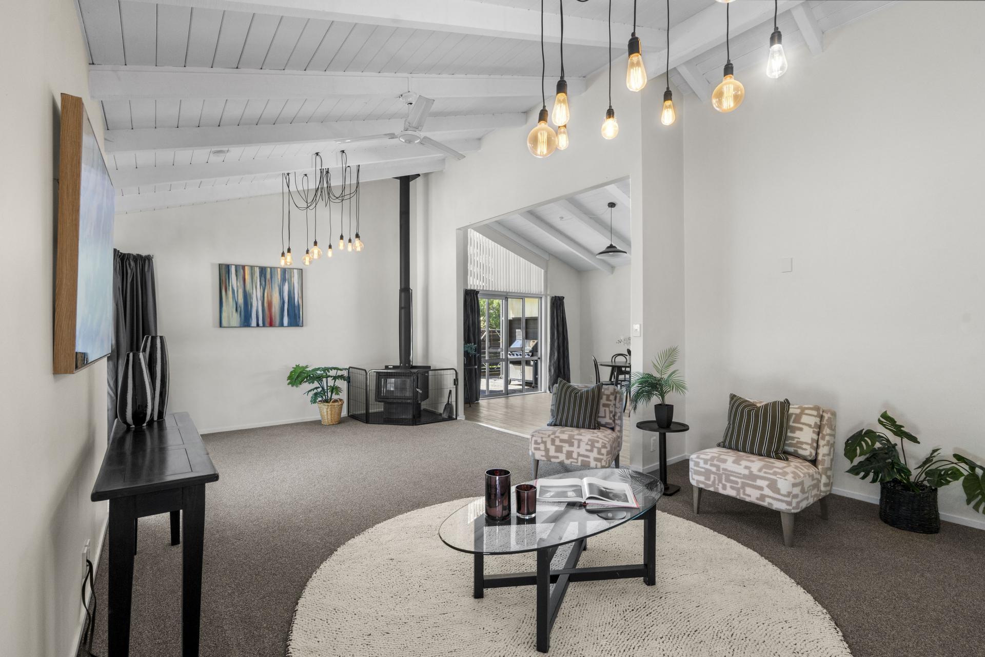 Well-constructed, the home is built from concrete block and weatherboard offering comfortable living with room to grow and add value. The open-plan kitchen and dining area complete with a heat pump, opens to a deck and enclosed garden. A spacious living room also opens to the deck, overlooking the lawn and established trees, and a Masport log burner adds warmth and charm.