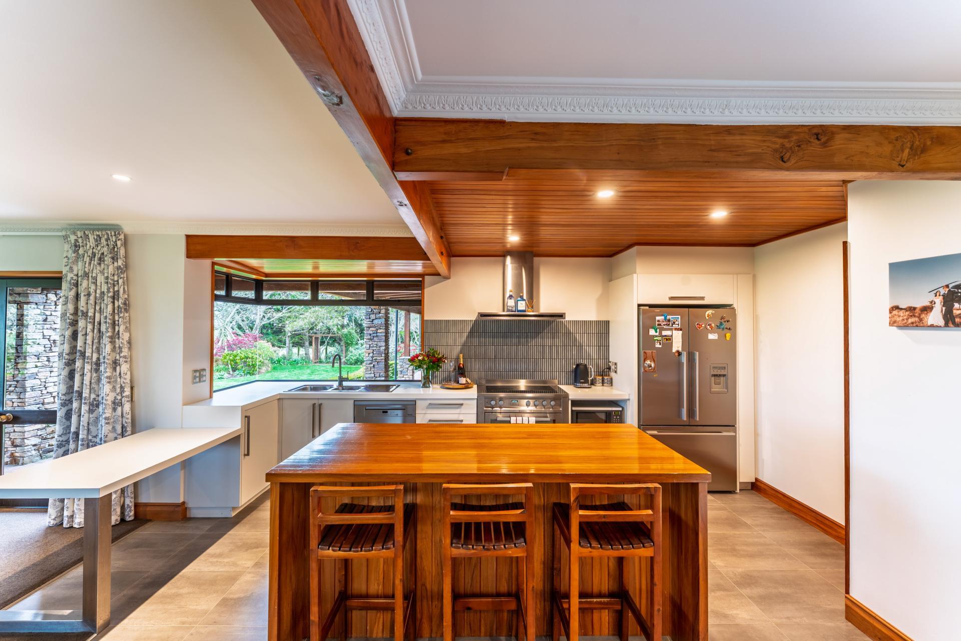 The heart Rimu detailing, cathedral ceilings, and schist fireplace create a warm, enduring atmosphere, while double heat pumps and log fires provide year-round comfort. A fully self-contained unit with kitchenette, bathroom, and its own heat pump offers perfect flexibility for extended family, guests, or a home business.