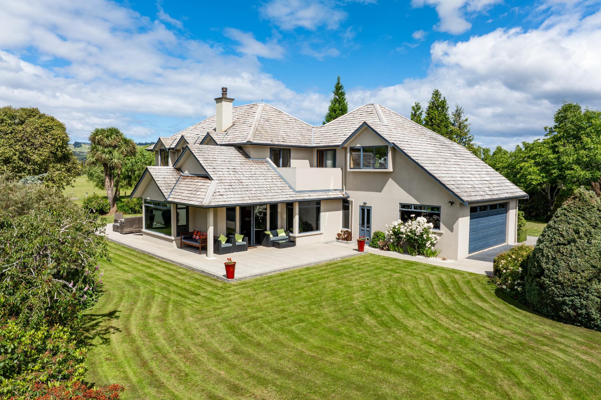 Ascend the circular stairwell to the four double bedrooms, each with built-in wardrobes, - master with ensuite and walk-in wardrobe, and there's also the third bathroom, including a spa-bath, as well as separate toilet. Heated by log burner with wetback, the home is double glazed throughout. Set amongst three decades of established garden and surrounds, the sense of quality of establishment and private rural living abounds despite its very handy proximity to urban amenities.